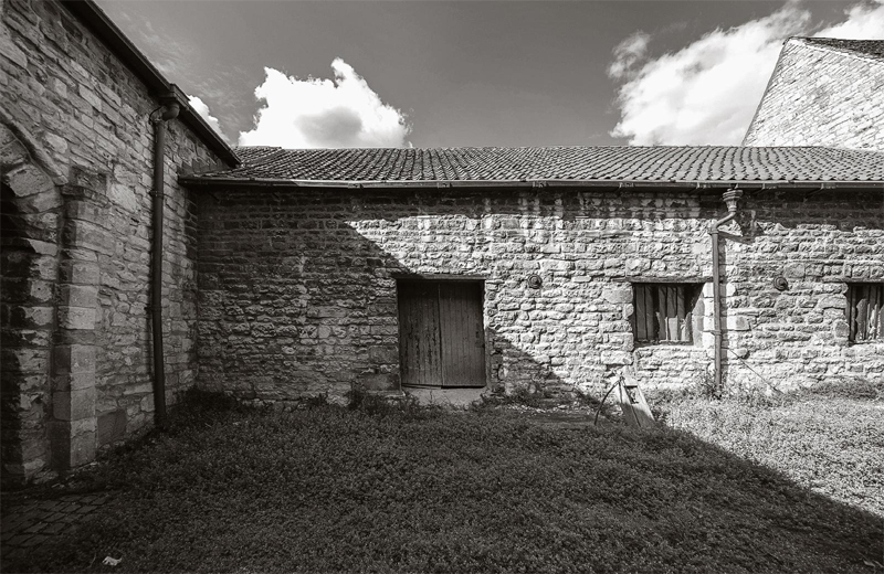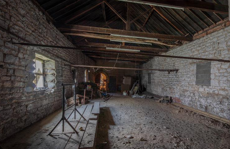 There is a two-storey building and on the ground floor the building has two doorways and two windows in the south wall with a single window in the north, whilst upstairs, underneath there is a simple oak roof. There are also two reused windows in the south wall on either side of a fire place and a third in the north wall. The use for this building is not entirely clear and it may have intended to be used as domestic premises.